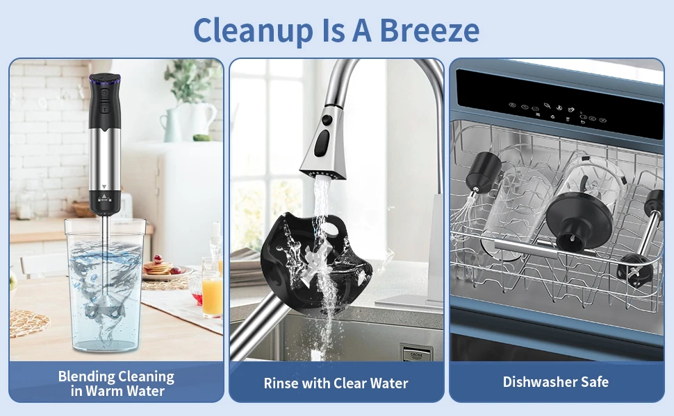 • EASY TO USE & CLEAN – This imersion blender features an ergonomic handle that fits the curve of your hand, providing a comfortable grip that prevents fatigue during long use. The non-slip material ensures your hand stays secure while blending, offering a safer experience. Whether you’re using it at home or in a professional kitchen, this hand held mixer wand delivers an outstanding user experience. Its detachable design makes cleaning a breeze—you can simply mix with warm water, rinse it off, or pop it in the dishwasher for quick maintenance.