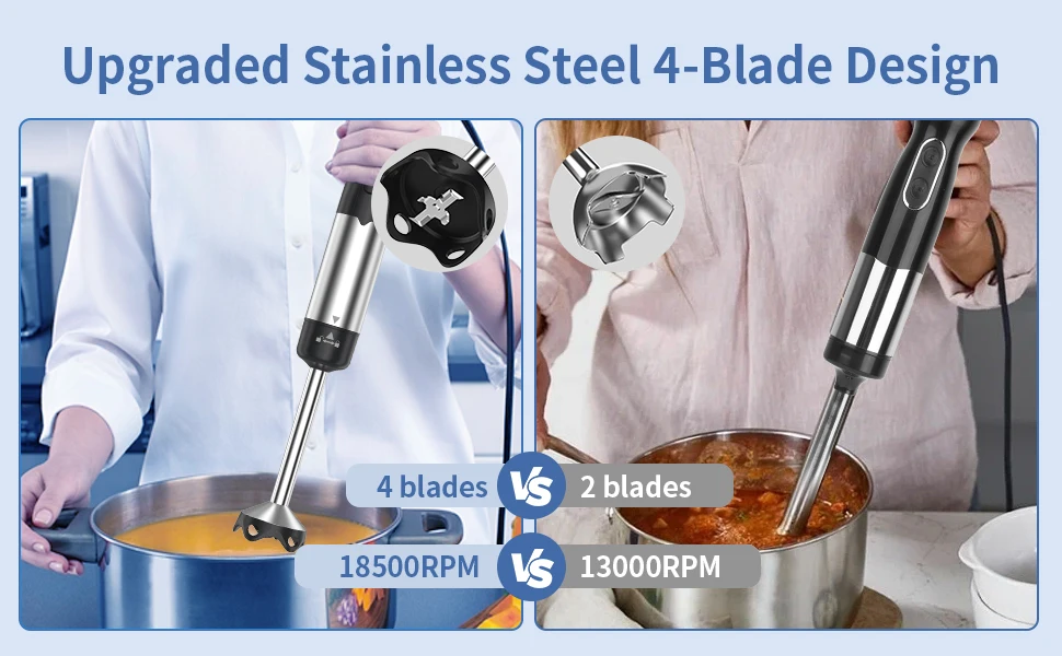 • POWERFUL & EXCELLENT PERFORMANCE – Equipped with an 1200W sensor motor and 4 stainless steel blades, this immersion blender handheld delivers powerful performance and even cutting. Whether you’re working with hard vegetables, meats, or other tough ingredients, this hand held blender blenders sticker immersion handles them effortlessly, quickly blending them to the desired consistency. It ensures optimal performance with a variety of ingredients, making your cooking process more efficient and seamless.