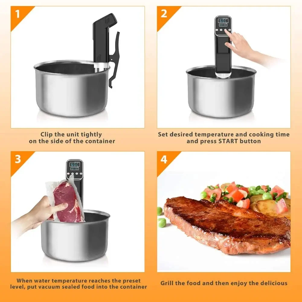 Recommend recipes: Steak (57 ° C 1/2 hours), chicken breast (62 ° C 35 minutes), eggs (75 ° C 13mins), carrot (85 ° C) 25 minutes. Circulation pump: 10L Max. Chef at home – a sous vide to your game in the kitchenThis way of cooking will create the most amazing and life changing meats, chicken, fish, vegetables, and just about anything you throw at it. The most important feature of this is that the food cooks in its juices. They turned out to be perfectly medium pink, meat comes our tender and tasty. It allows anyone to cook a restaurant quality meal at home. Recipe tips:Steak -132 ° F / 55.5 ° C, 6 hoursSalmon-110 ° F / 43 ° C, 30-45 minutesChicken-140 ° F / 60 ° C, 30 minutesEggs-140 ° F / 60 ° C, 10 minutes