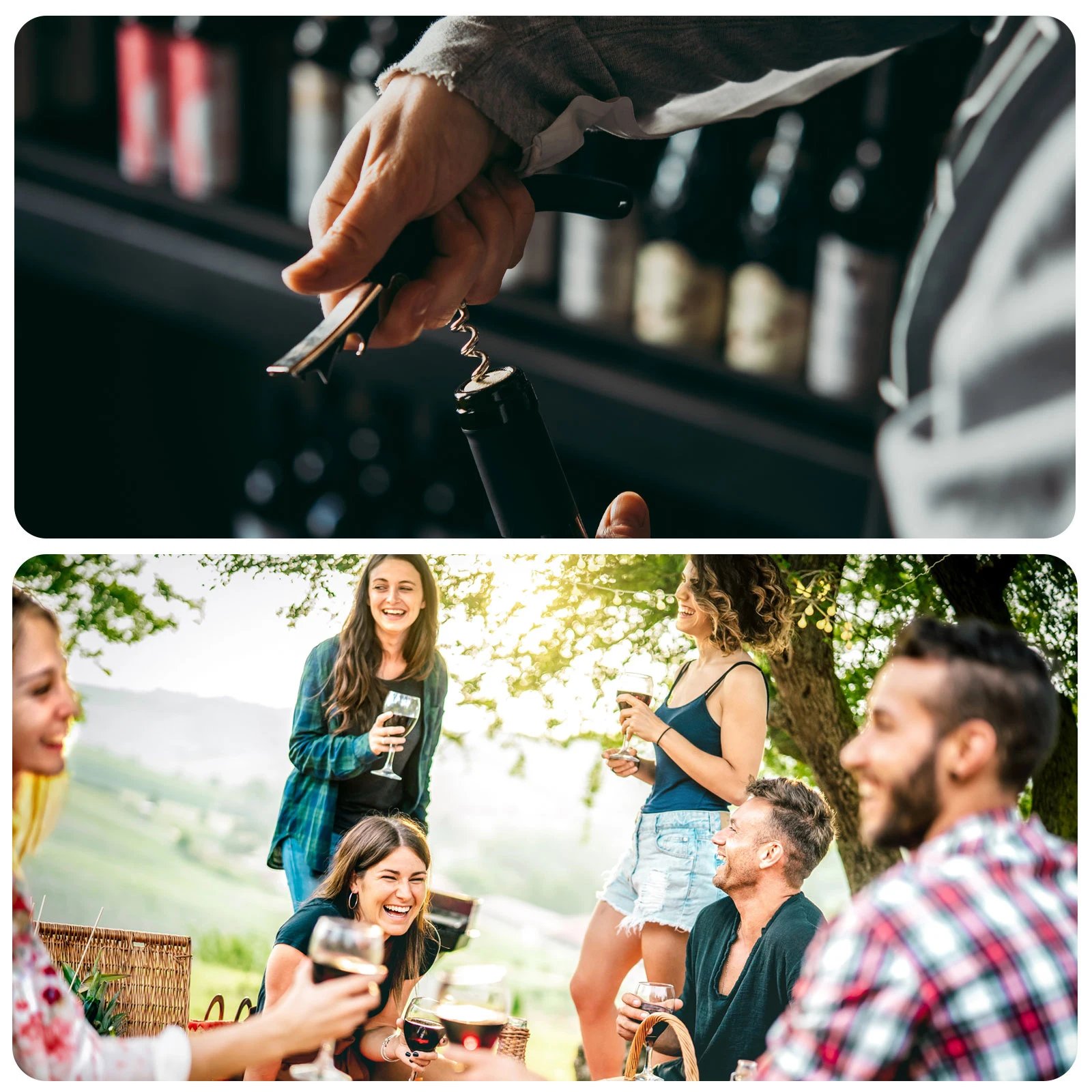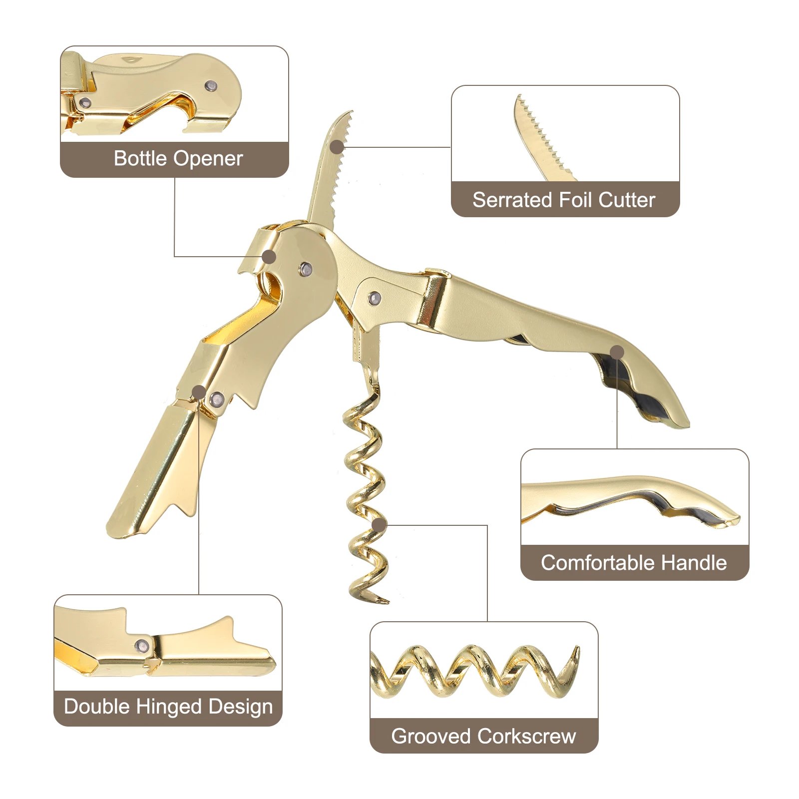 Multifunctional wine opener, with serrated foil cutter for removing any foil and can be used as a knife for opening cans, slicing the sealed bag etc, a bottle opener for opening bottle caps, beer, soft drinks, soda water, grooved corkscrew with double hinged design can help you pull the cork from the wine bottle easily.