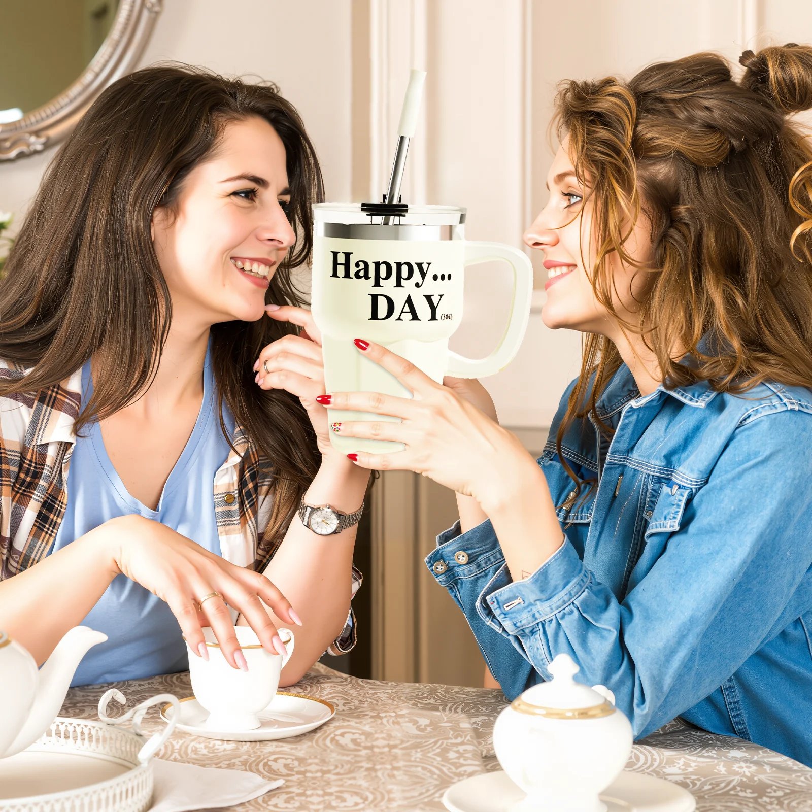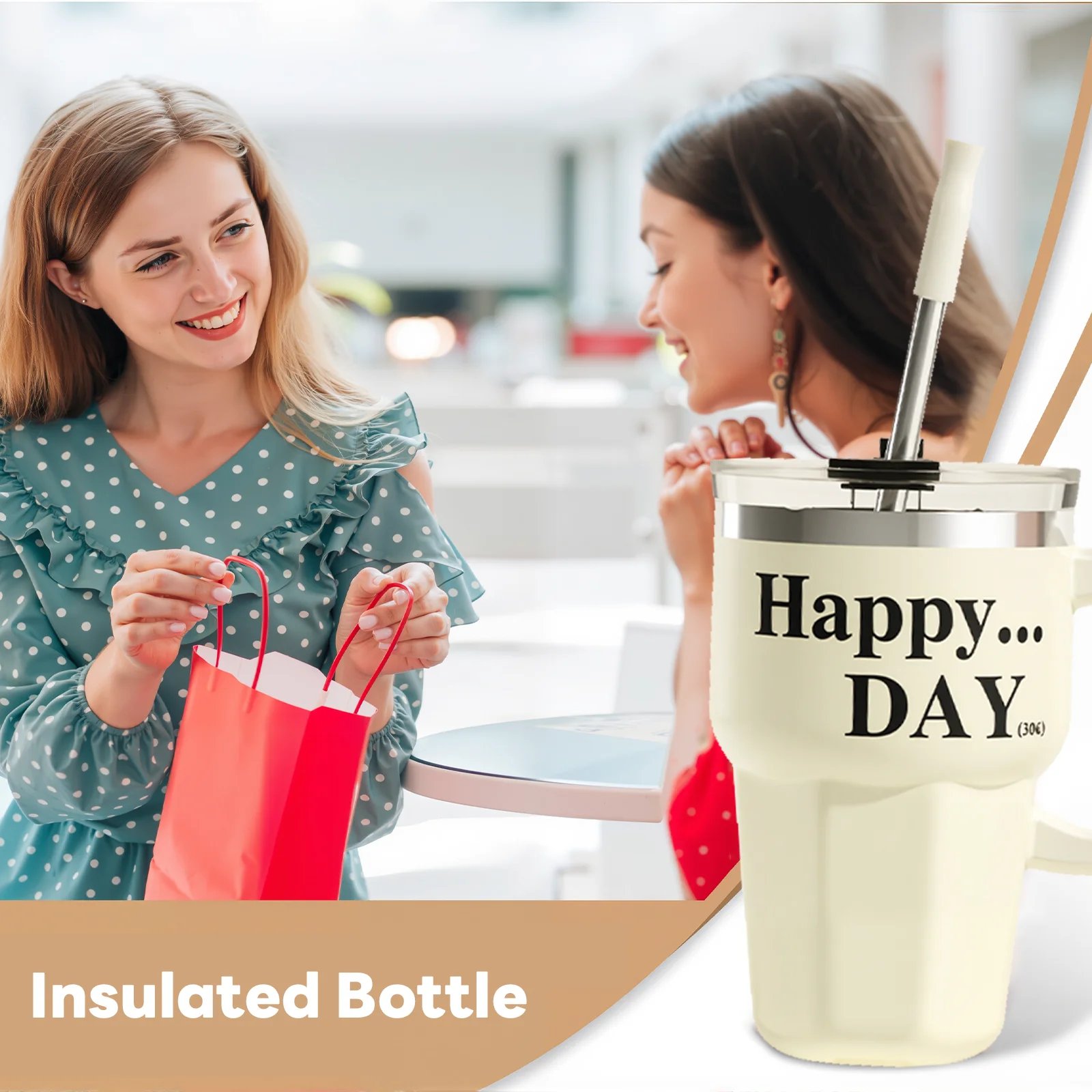 20oz Vacuum Insulated Tumbler with handle straw, Uniquely coffee mugs for women , 316 Stainless steels Cup with Happy day pr