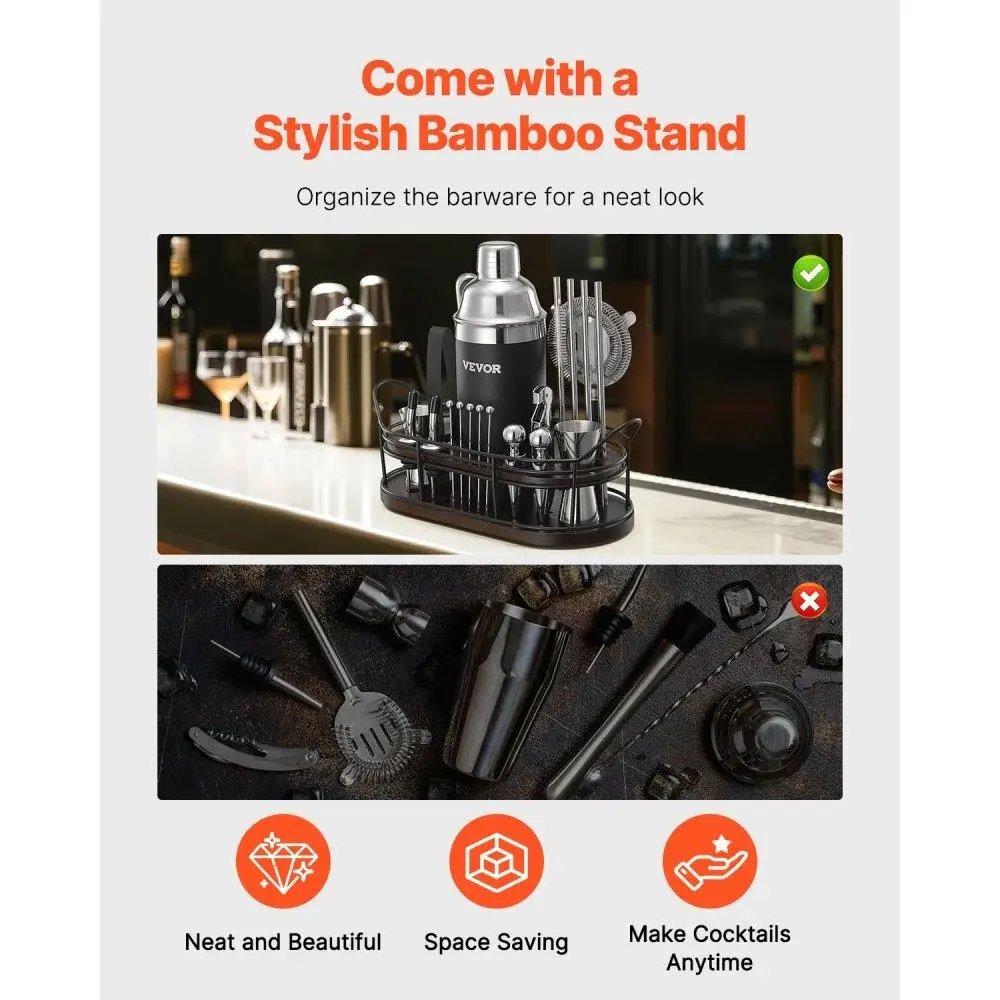 - Display & Storage Stand: The thoughtfully designed bamboo stand makes your bar neat and beautiful. It not only keeps your barware organized, but also saves your space, showcasing a professional flair and unique taste in your bar