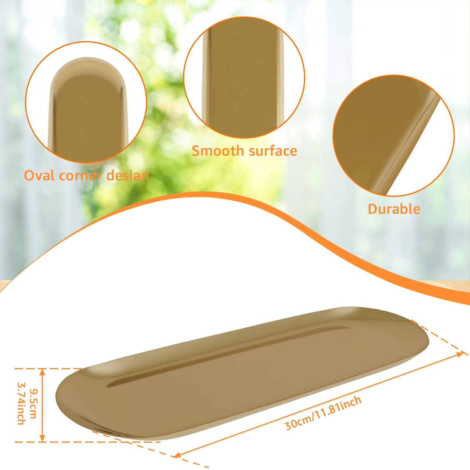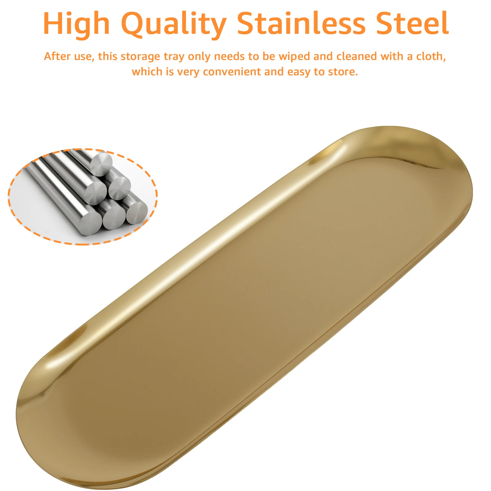 Description: This stainless steel decorative tray features an oval shape and measures about 30×9.5cm/11.8×3.7in. Extra large and perfect for storing jewelry, clutter, small items and more.