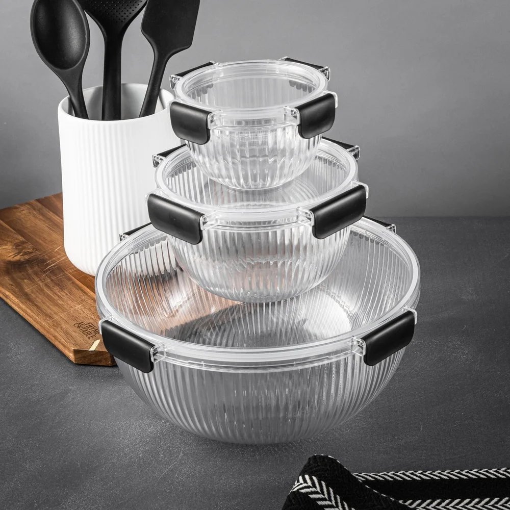 Elevate your kitchen with the 6PC Ribbed Nesting Bowl Set. Includes a 4. 4-liter, 1. 2-liter, and 420 mL bowl. Each is crafted from durable, food-safe material with a modern ribbed texture. The clear design and snap-lock lids keep food fresh and blend seamlessly with any décor. Bowls nest together for compact storage. Offers style and functionality for all your food prep and storage needs.