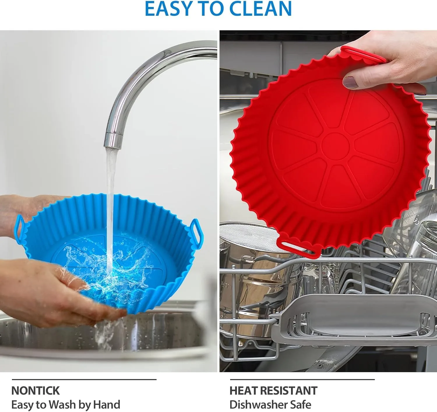 【Easy to use】The air fryer silicone bowl has handles on both sides, making it easier to take out food and transfer it to a plate or bowl with the help of tools. Be especially careful when removing the pan from the basket! The silicone air fryer inner pot is still hot. Double-sided can be used. The front can be used as an air fryer and the back can be used as a cake pan.
