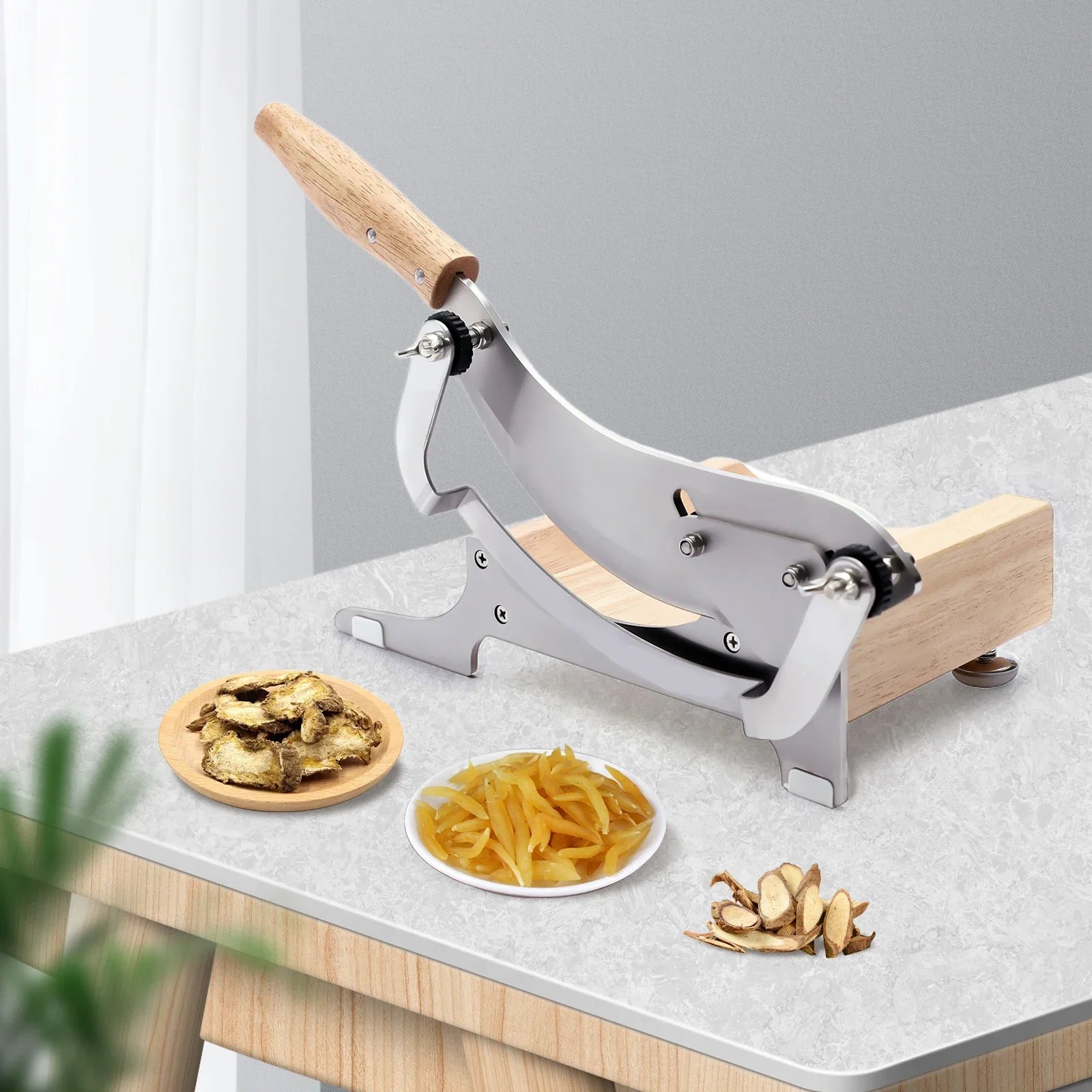 Adjustable Design: You only need to use the wing nuts on the thickness baffle to adjust the thickness of the slice (0-12mm), or you can remove the thickness baffle for cutting to meet different processing needs.