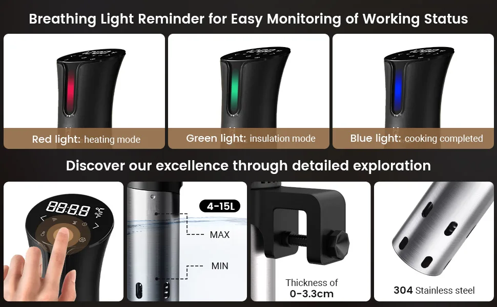 [Powerful Yet Quiet Cooker] Using a high-end thermostat control chip, this sous vide cooker heats evenly in all directions with a full power output of 1100 watts, 360° water circulation. Ultra-quiet with less than 15 dB noise at 1 m.