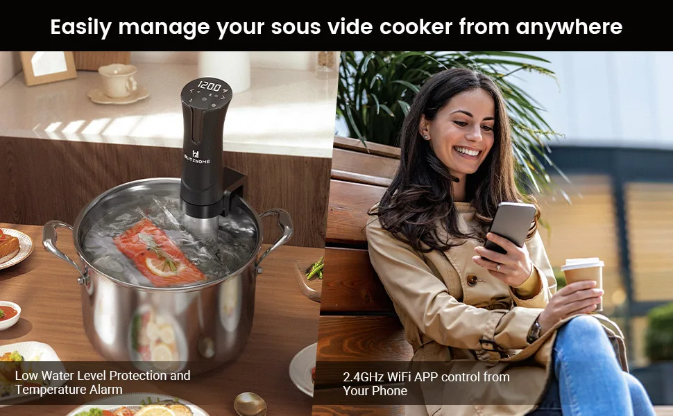 [Wifi Remote Control] You can use the Blitzhome app to complete the remote control, which has 30 recipes for you to choose, the kitchen novice can also operate freely.The WIFI sous vide cooker ONLY support 2.4Ghz WIFI, but once was connected with your router via APP, then you could SET and Monitor the Sous Vide Machine on your phone wherever you’re.