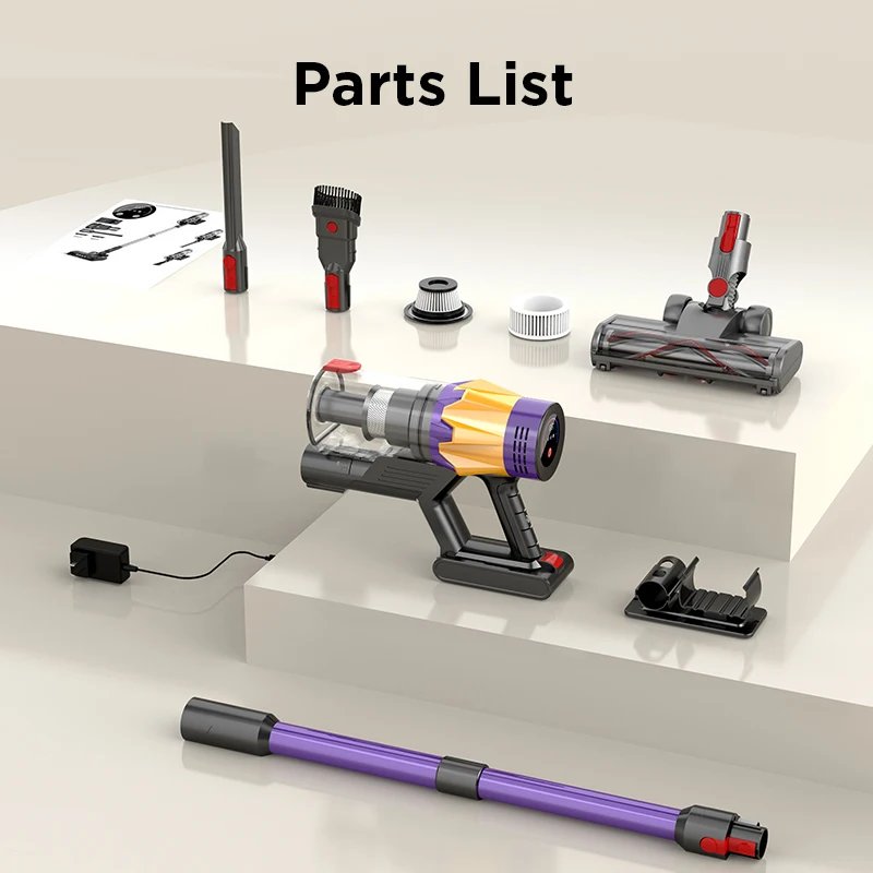 Included 1 * body (handle / battery / ventilation filter / dust cup / stainless steel filter / inlet filter), 1 * telescopic hose, 1 * brush and floor roller, 1 * wall bracket, 1 * cleaning nozzle, 1 * hair cleaning tool, 1 * quick start instructions, 1 * adapter.