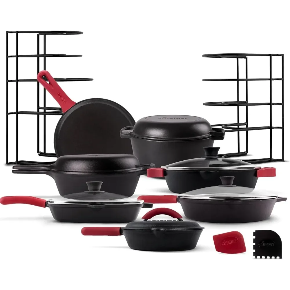 • CHEF’S COMPLETE SET: 8″ Skillets with Cast Iron Lid + 10″ Dual Handle Braiser Pan with Glass Lids + 12″ Skillet with Glass Lid + 10.5″ Square Grill Pan with Glass Lid + 10.5″ Round Flat Griddle + 2-in-1 Multi-Cooker + 12″ and 15″ Panracks + Silicone Handle Grips for everything AND Pan Scraper for easy clean-up: This overwhelming selection provides you with the full array of cookware, keeping you equipped for all culinary endeavors!