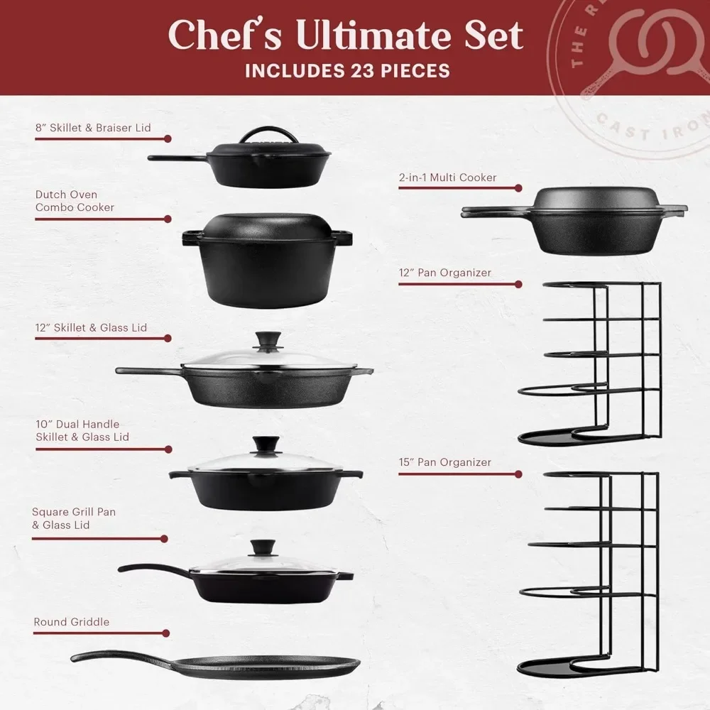 Cast Iron 23-Pc Cookware Set – 8″ Skillet Cast Iron Lid 12″+Lid 10″ Braiser with Lid Grill Pan Lid Griddle