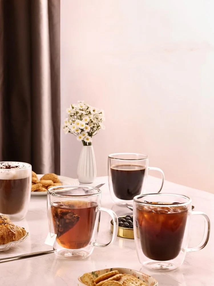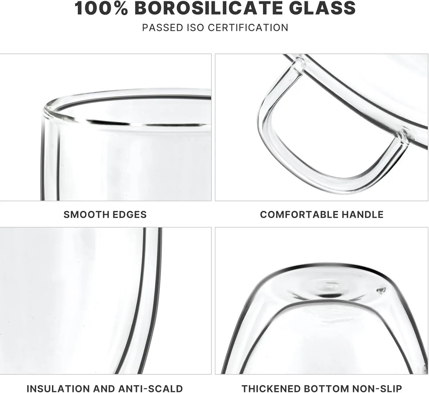 The double walled glass coffee mugs with a transparent smooth finish that gives it a crystal clear look,your coffee or tea seem is suspended in mid-air, a captivating sight!Beautiful addition for your dining table.The coffee cup lip adopted the closed process,and highly polished rounded rim make them taste the flavor of coffee better.