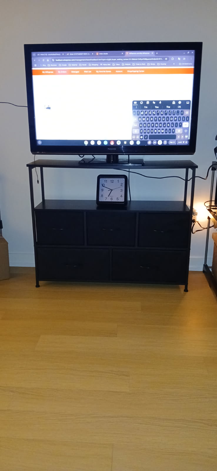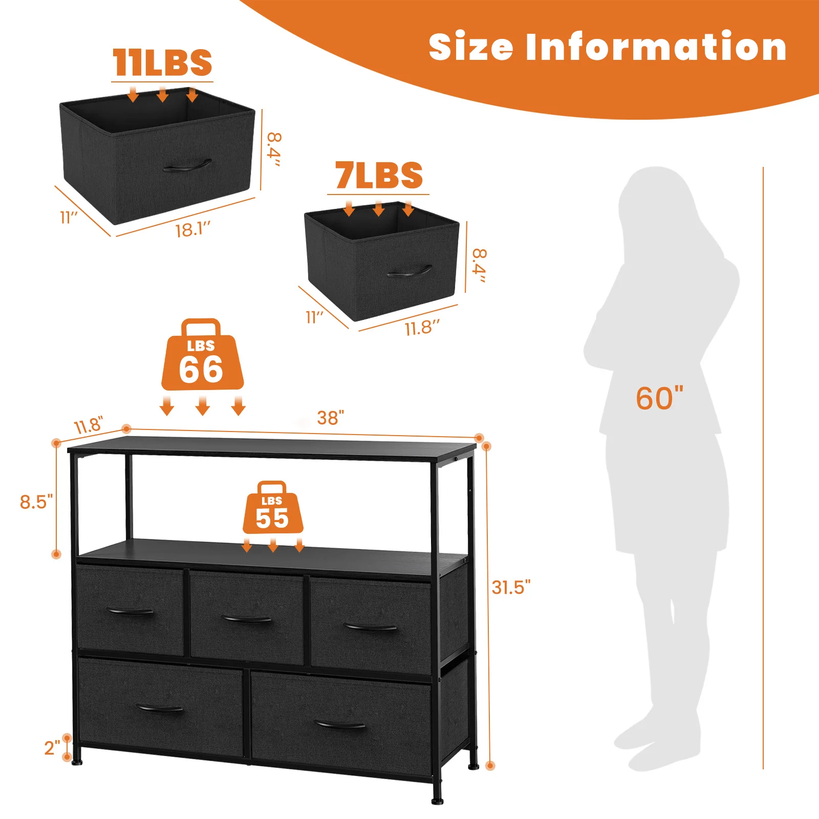 【TV Stand with Storage】This TV Stand comes with 5 removable drawers that offer ample storage capacity for organizing various items. Each large drawer can store at least 12 ordinary adult T-shirts or 7 pairs of jeans. And small drawers can be used to store socks, gloves, underwear, etc. The full size of this TV stand 5-drawer dresser is: 11.81″ D x 39.4″ W x 31.5″ H.