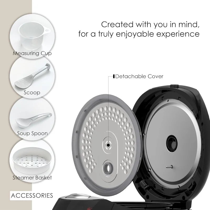 • INCLUDED ACCESSORIES: Comes with a user manual, measuring cup, steam tray, Soup Spoon and scoop.