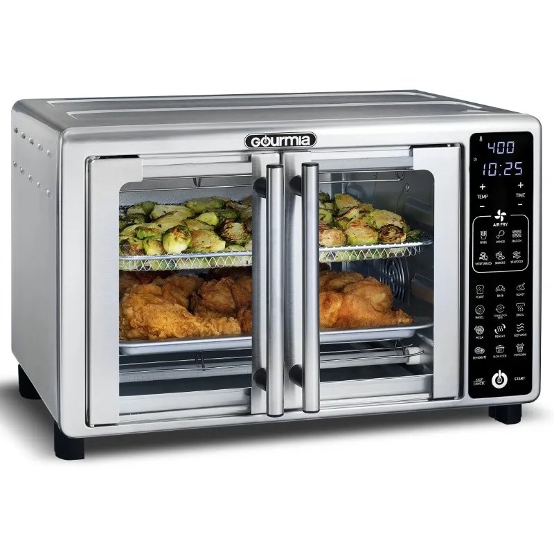 The New Gourmia 1700W 6-Slice Digital Toaster Oven Air Fryer uses advanced technology for great results. Its FryForce 360 Technology quickly circulates hot air, cooking food evenly for a crisp, golden finish. With 19 One-Touch Presets, you can easily cook a variety of dishes. The touchscreen lets you adjust time, temperature, and toast settings. A large window lets you see your food as it cooks, while easy-to-open French doors make it simple to use. It’s a great mix of style and efficiency.