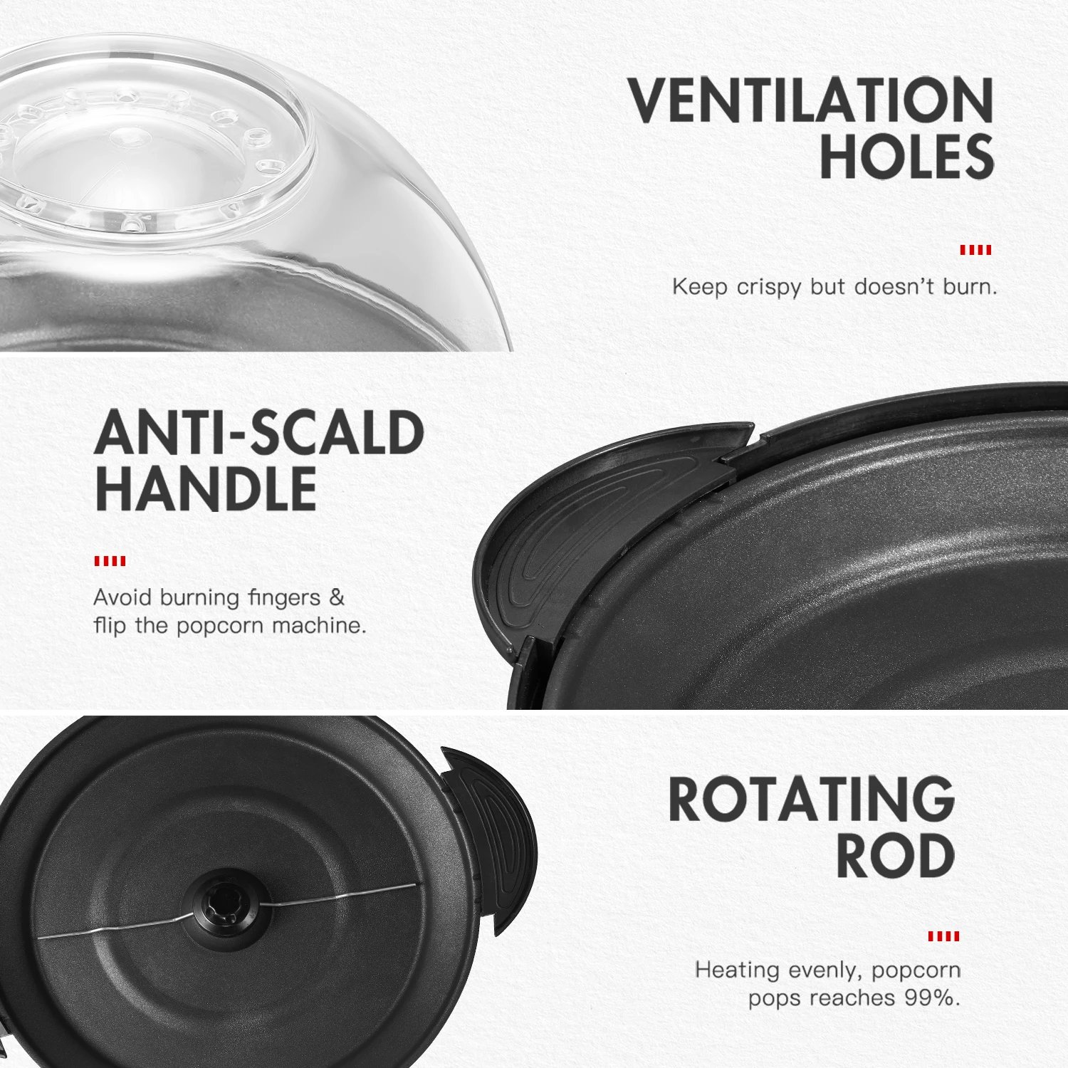 Cool Touch HandlesPrevent scalding when you inverted the popping plate, makes operations more safe. |
