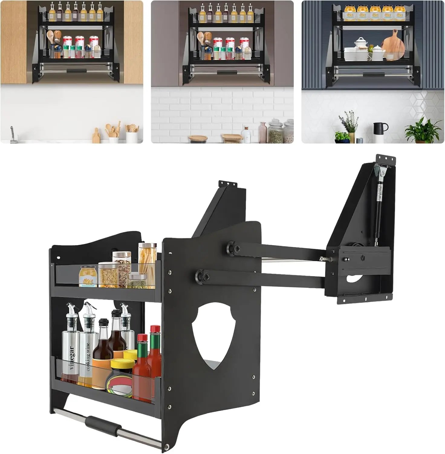 Our pull-down cabinet organizer can be easily lowered to the most suitable working height for you, making the cooking process more energy-saving and comfortable. It’s a scientific and reasonable layout to meet your needs for a variety of storage of kitchen utensils.