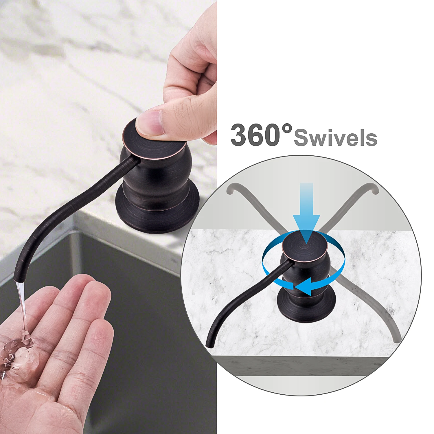 — This soap dispenser has a 3.2-inch nozzle that reaches over the sink, the pump head swivels 360 degrees. You can pump it and output a suitable amount of soap easily. There is no leak, clog or jam when pressing for soap.