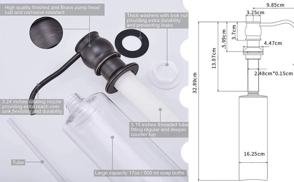 — Long shank perfect for granite counter tops and deep deck installation, reservoir bottle is clear for easy viewing of contents, perfect for Liquid soap, Lotion or Liquid detergent.