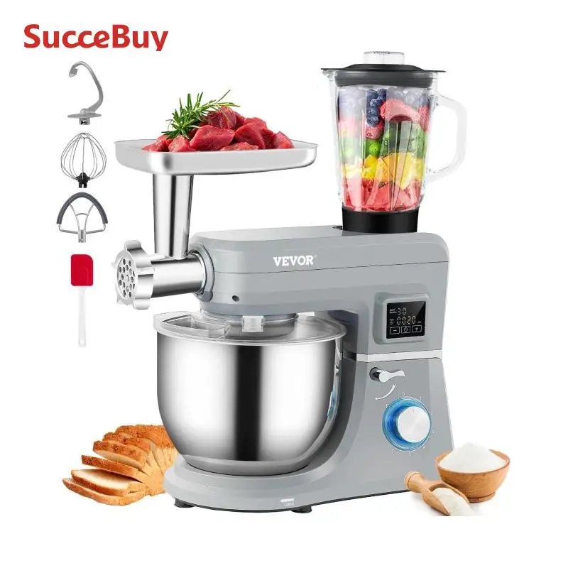 Complete Accessory Set for Versatile Use: Included with this mixer are three essential attachments: a dough hook for kneading, a beater for mixing, and a whisk for whipping, all dishwasher-safe. Additional tools, such as a scraper, splash-proof cover, front meat grinder, and top juice cup, expand its functionality for all-around kitchen convenience.
