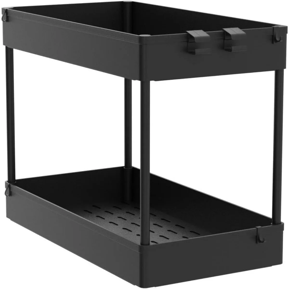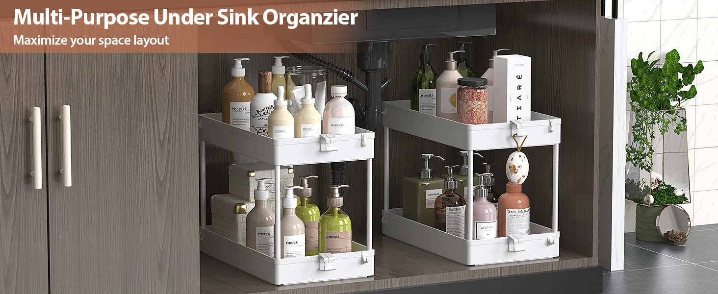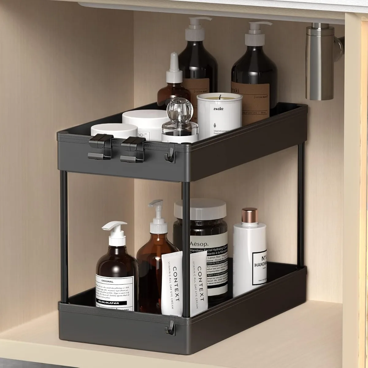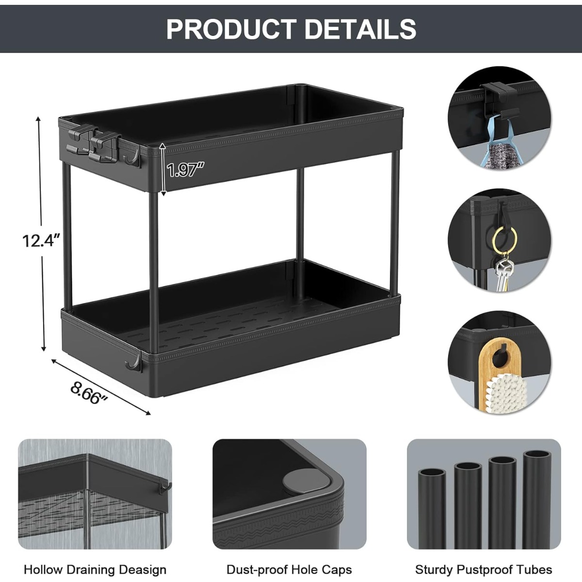 Under Sink Organizer, 2 Tier Under Sink Storage Organizer, Bathroom Standing Rack, Bath Collection Baskets with Hooks, Black