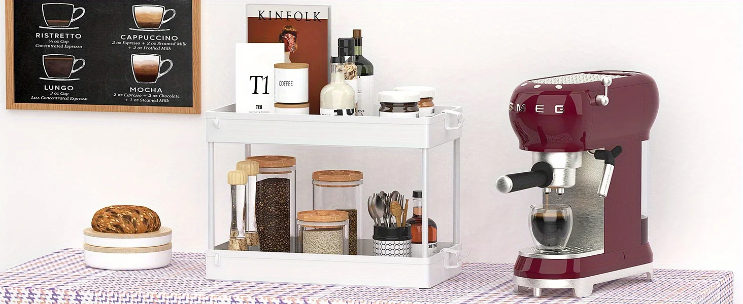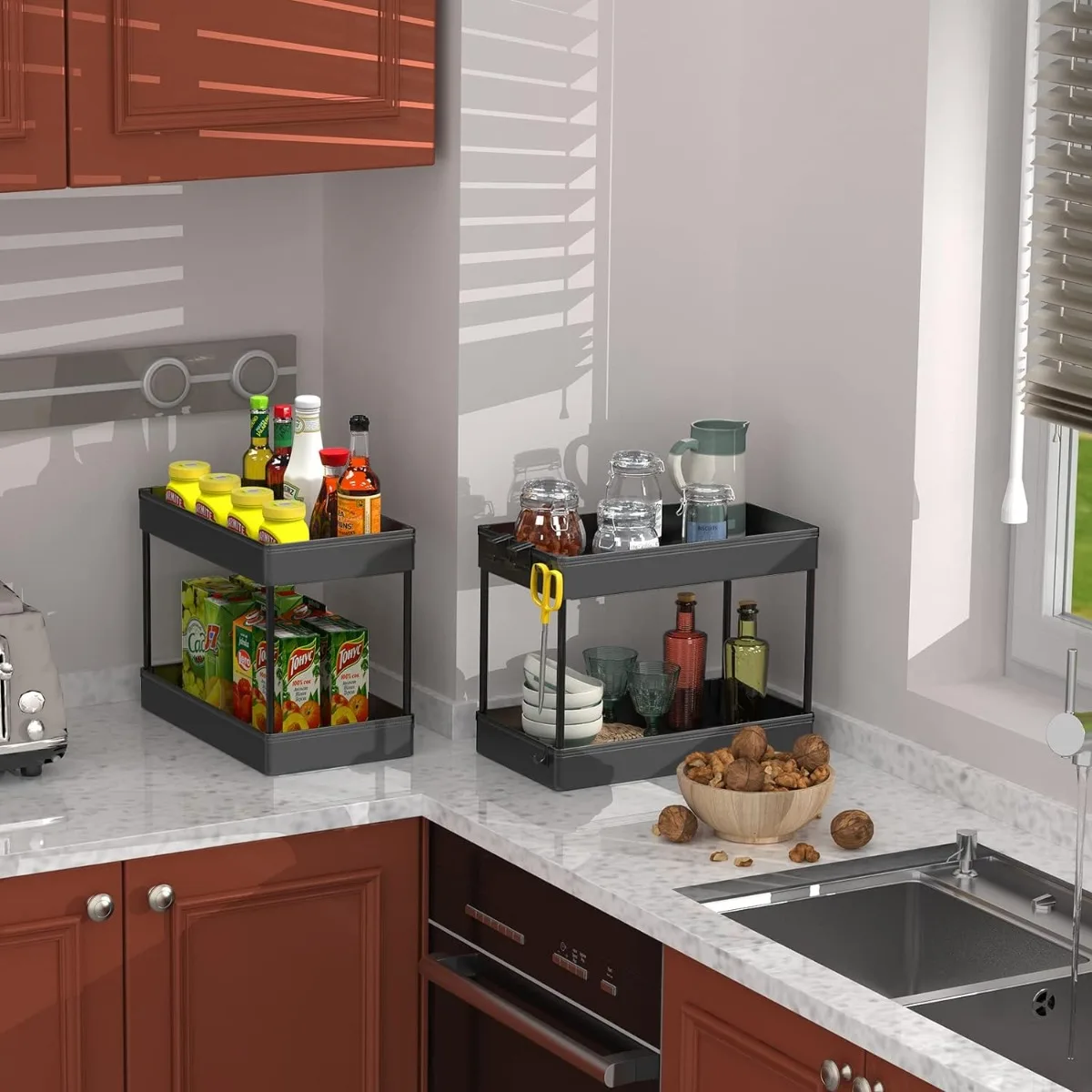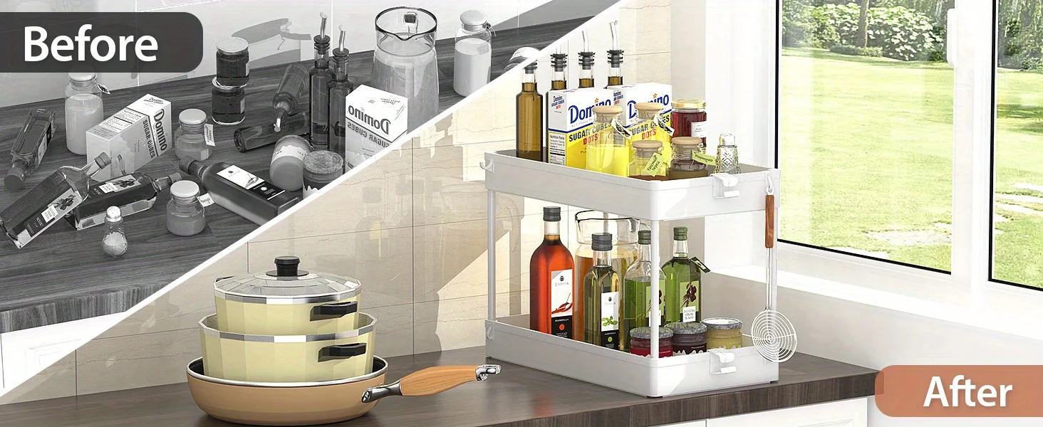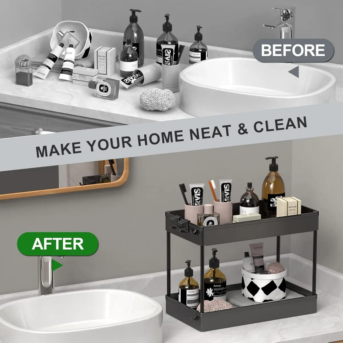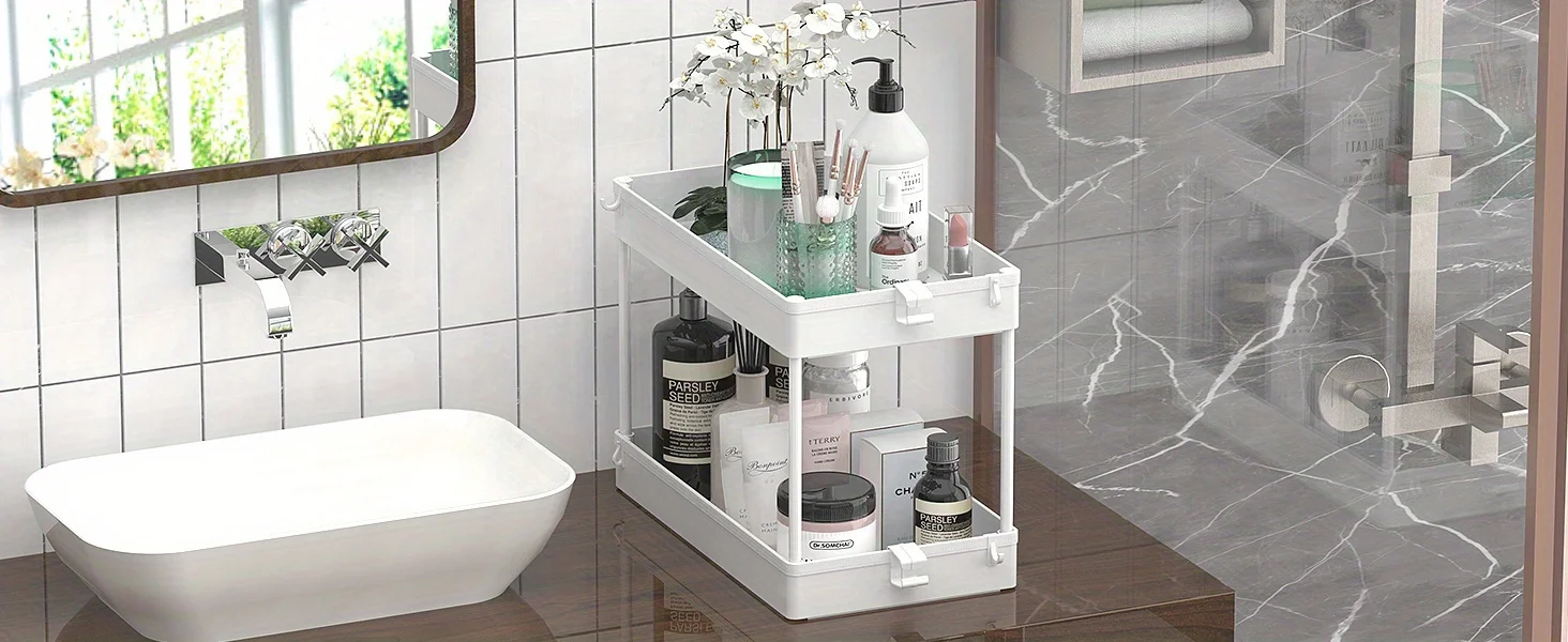 Under Sink Organizer, 2 Tier Under Sink Storage Organizer, Bathroom Standing Rack, Bath Collection Baskets with Hooks, Black