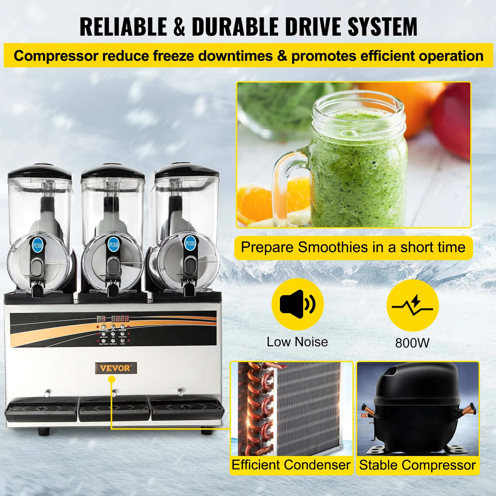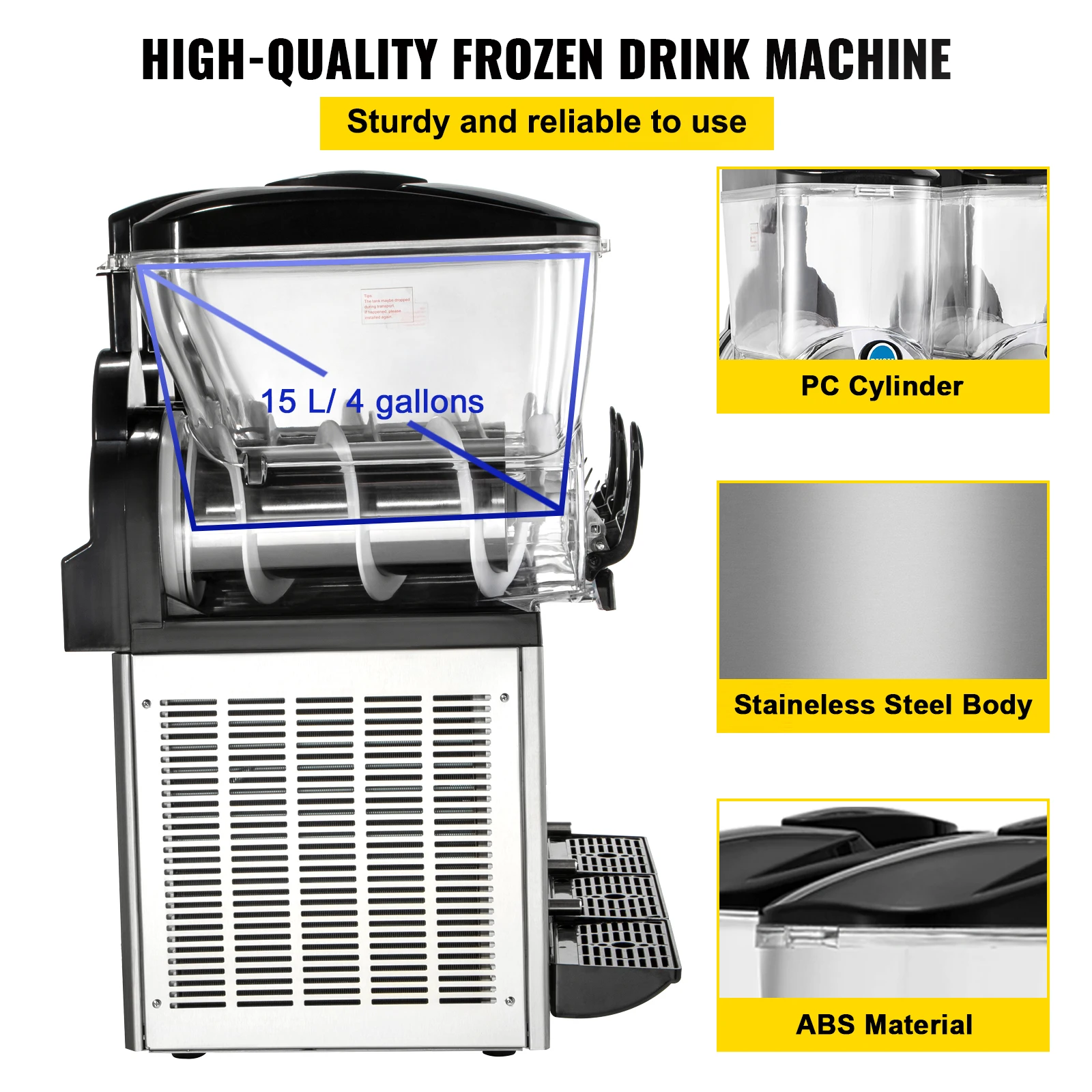 45L/ 12Gal Slushy Machine: With triple tanks 15 L x 3 / 4 US gallon x 3 capacity, this frozen slush machine can hold a great number of slushies and drinks, and it can be used for different flavors. An interior bowl light illuminates your beverages, thus showcasing their vibrant colors and helping them sell themselves.