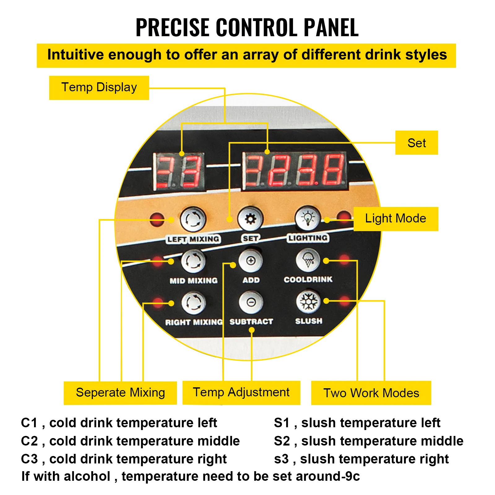 Precise Control Area: Brief control panel is equipped on the machine. Each bowl operates independently and can be switched on/off or between cool drink and slush modes. Designed with the preservation function, you can set the temperature from 26.6 °F to 28.4 °F (-3~-2 ℃) to keep the slushies fresh. You can use the panel according to your needs.