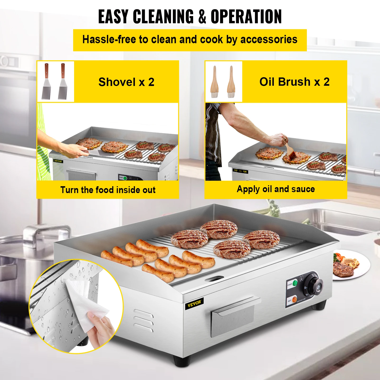 For Various Food: The electric flat top grill can be used in family or commercial places, such as restaurants, shops, roadside stalls, and snack bars; It is very suitable for processing pancakes, crispy bacon, roast cheese, rich breakfast, fried dishes, omelets, pizza, steak, and hamburgers.